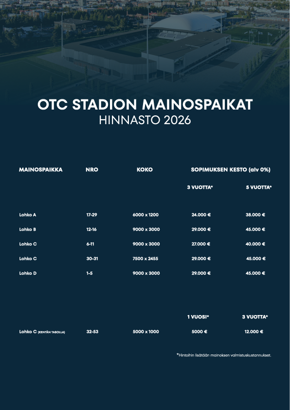 Yrityksille tämä tarkoittaa jatkuvaa, ympärivuotista näkyvyyttä – mahdollisuutta tavoittaa yleisöjä, joita ei muualla Pohjois-Suomessa ole mahdollista kohdata vastaavalla laajuudella. LED-ratkaisut, kentänlaitamainokset sekä suuremmat, kiinteät toteutukset tarjoavat monipuolisia vaihtoehtoja erilaisiin tarpeisiin. Samalla AC Oulun monilajiseuran vahva yritysverkosto luo kumppaneille täysin uudenlaisia liiketoimintamahdollisuuksia. OTC-Stadion ei ole pelkkä areena – se on uusi kohtaamispaikka, joka nostaa brändin näkyvyyden ja vaikuttavuuden uudelle tasolle.